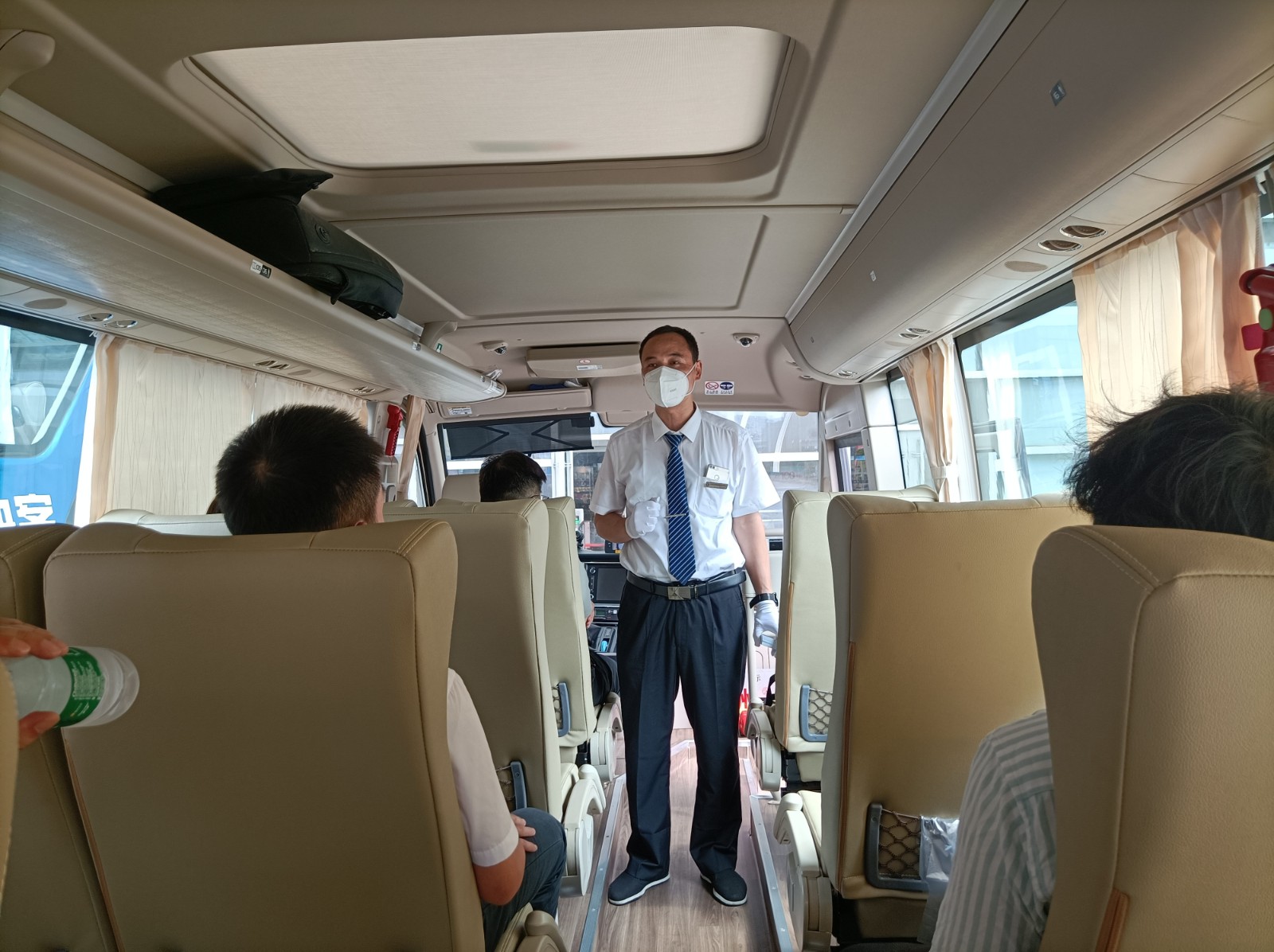 為迎接第一批旅客,班車提前做好了車輛檢查等準備工作,駕駛員標準著裝提前等待,引導乘客上車。發(fā)車前對乘客進行安全喊話,并提醒乘客系好安全帶,佩戴好口罩,確保旅客安全通暢。